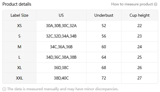 Size: XS [for 65ABC],S [for 70ABC],M [for 75ABC],L [for 80ABC],XL [for 85ABC],XXL [for 90ABC]]