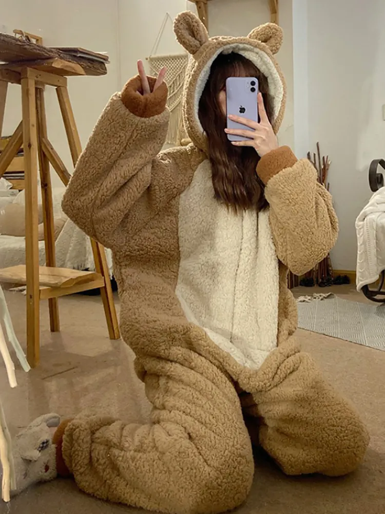 The bear design is the star feature of these pajamas. Whether it's a full-body onesie with an attached bear hood, a pajama set with bear ears, or simply a bear graphic on a top, the adorable bear details add a fun and whimsical element to your loungewear. The design typically includes cute bear ears, a face, and paw prints, making these pajamas not just a functional item, but a charming outfit that’s sure to bring a smile to anyone who sees you wearing them.