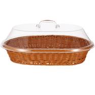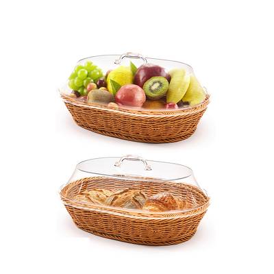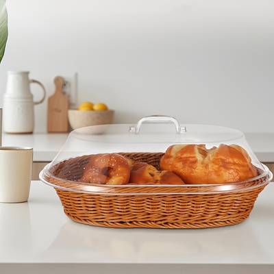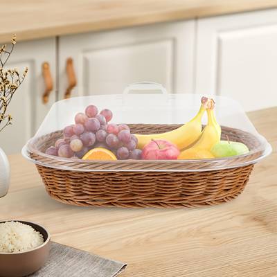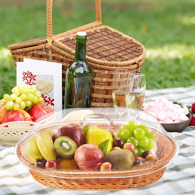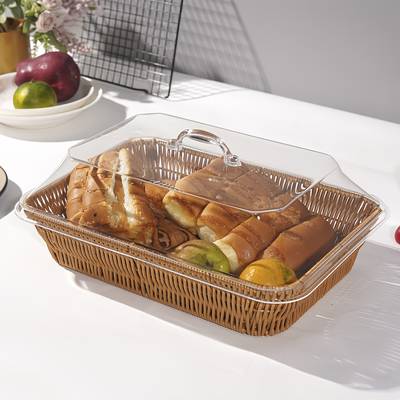 This round food basket is crafted from durable plastic wicker, giving it the classic woven look without the fragility of natural materials. The clear acrylic lid allows you to showcase pastries, fruit, or bread while keeping dust, insects, and debris away — great for outdoor use and buffet-style serving.