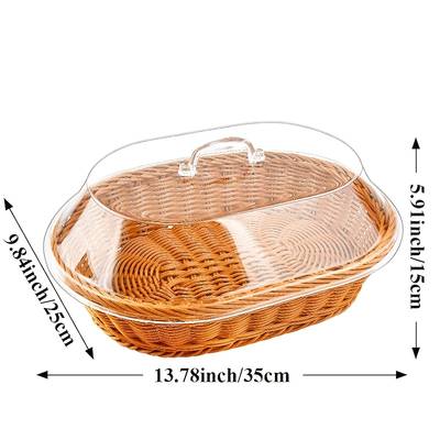 The PMMJ Wicker Bread Basket with Clear Acrylic Lid is a stylish, practical food display tray designed for bread, buns, pastries, fruits, snacks, or table serving. Made from durable plastic wicker with a transparent acrylic lid, it keeps food visible, protected, and fresh while adding a clean, elegant presentation to your kitchen or picnic setup.