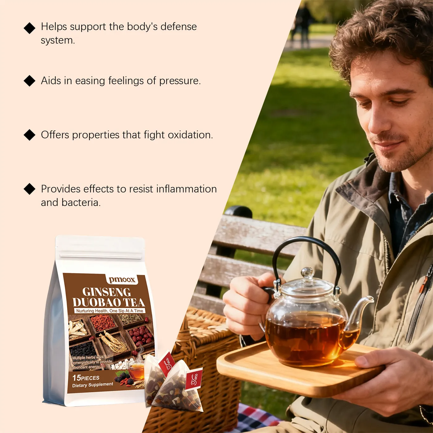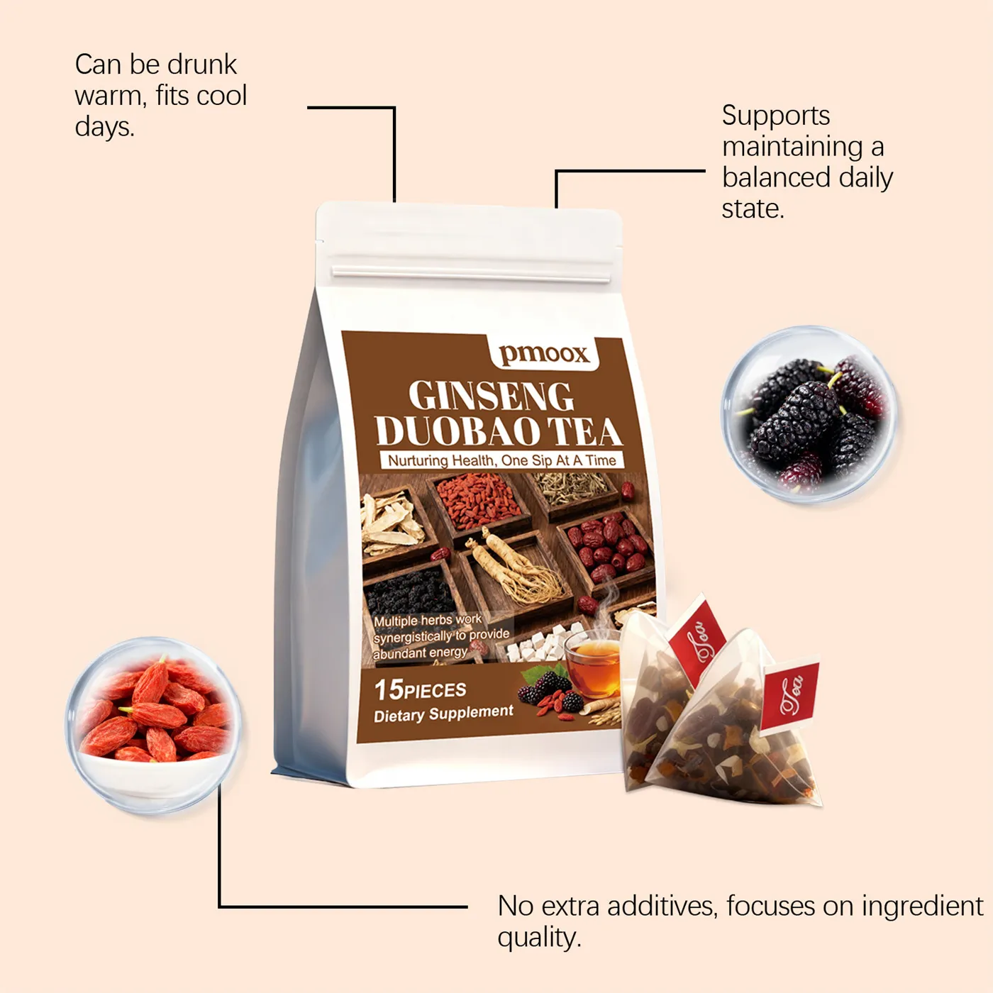 pmoox Ginseng Duobao Tea stands out as a natural and holistic way to enhance your energy levels, focus, and overall vitality. Unlike many energy drinks or caffeinated beverages, this tea provides a gentler boost with ingredients that promote long-term wellness. The combination of ginseng, goji berries, and other herbs is designed to work in harmony with your body to support natural energy production, mental clarity, and immune function.