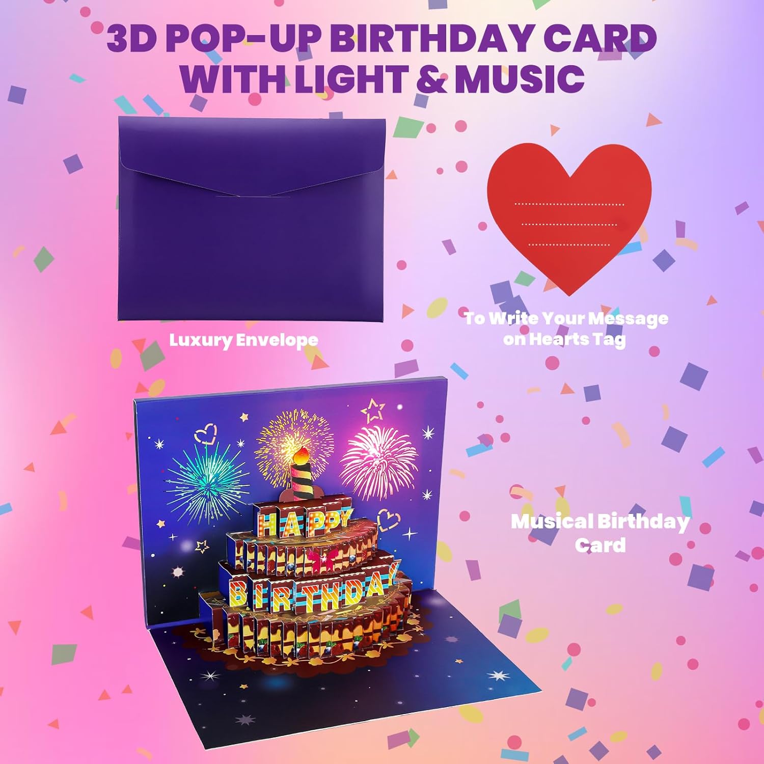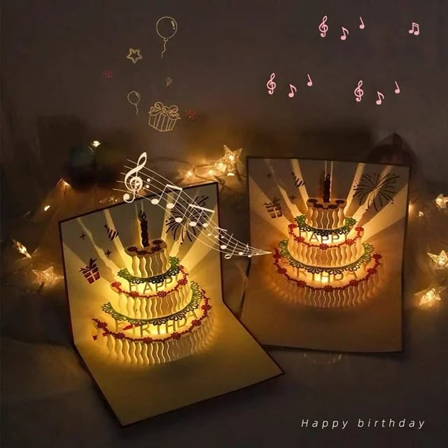 - Our stunning pop-up birthday cards feature advanced audio and lighting technology, adding luxury and magic to your greeting. The vibrant lights and synchronized music create a birthday ritual that's unforgettable.