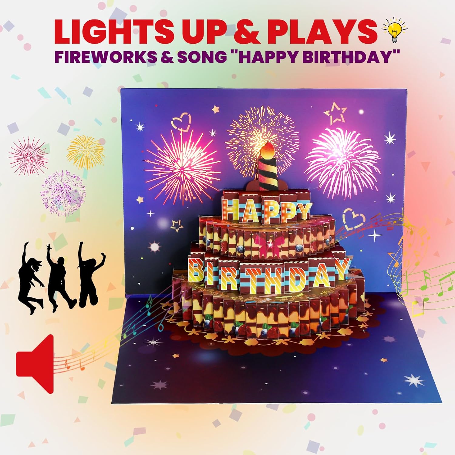 - With a 3D pop-up of a birthday cake and "HAPPY BIRTHDAY," our card lets you send a memorable greeting. The synchronized fireworks and "Happy Birthday" song play for 25 seconds—guaranteed to surprise and delight.