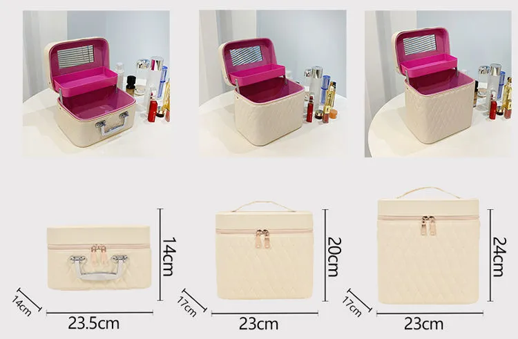 Portable Cosmetic Bag With Mirror Design Fashion Rhombus-Embroidery Double-layer Suitcase Large Capacity Make-up Storage Bags For Women