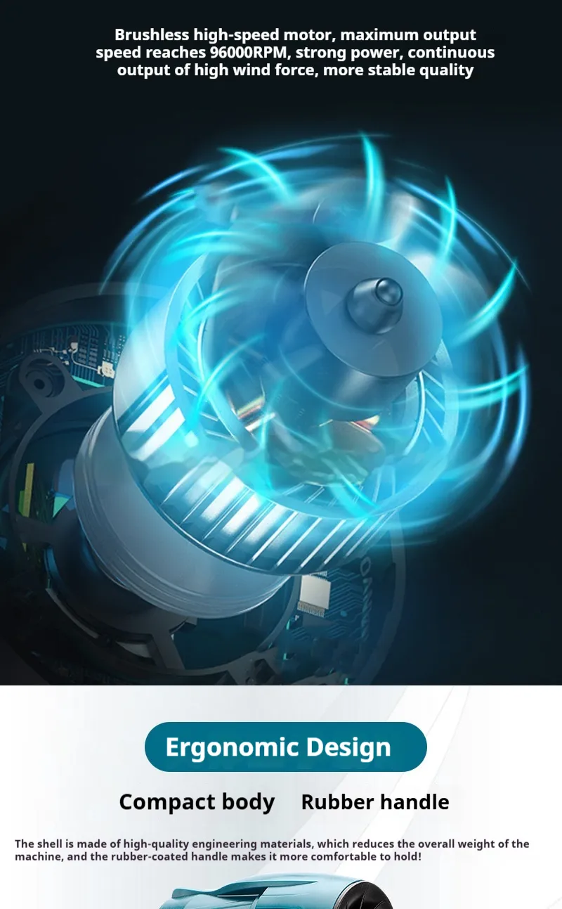 Equipped with a high-speed motor, the blower generates strong directional air pressure capable of removing dust, leaves, dirt, sawdust and moisture from various surfaces. The focused nozzle design channels airflow efficiently, allowing precise cleaning even in tight spaces such as car grilles, keyboards, engine bays, window tracks and workshop corners.