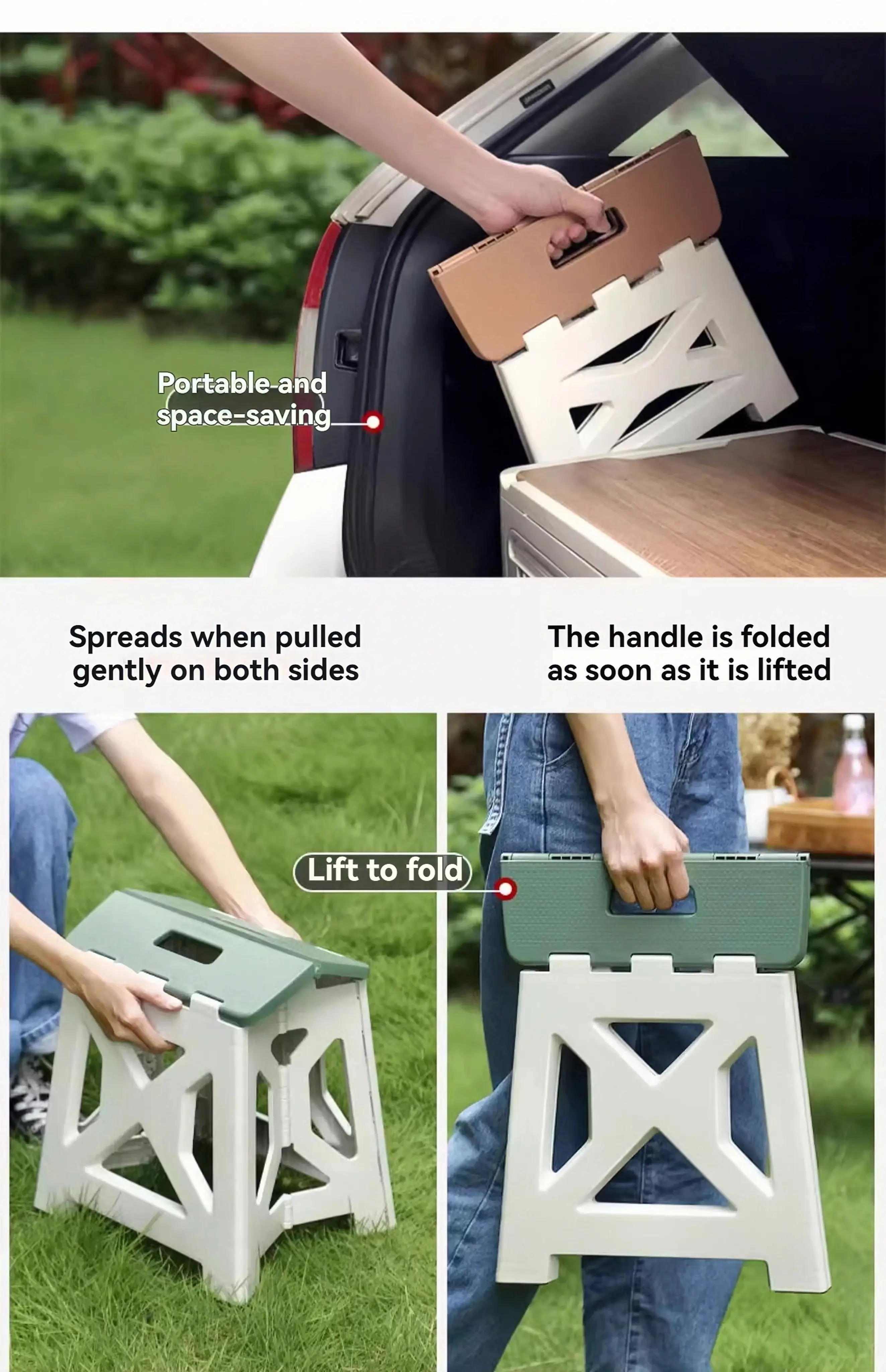 - The Portable Folding Stool is not just for sitting – it's a multifunctional stool perfect for use as a shoe-changing seat, a fishing stool, or a simple leisure seat for outdoor activities.