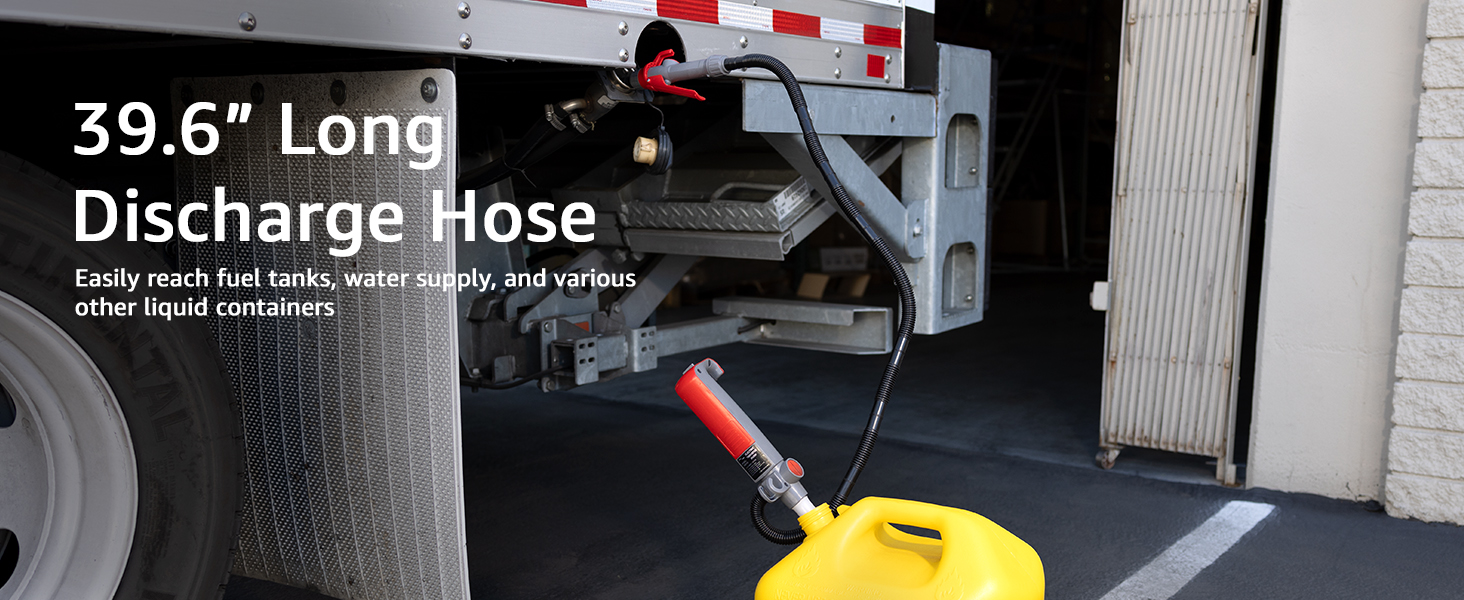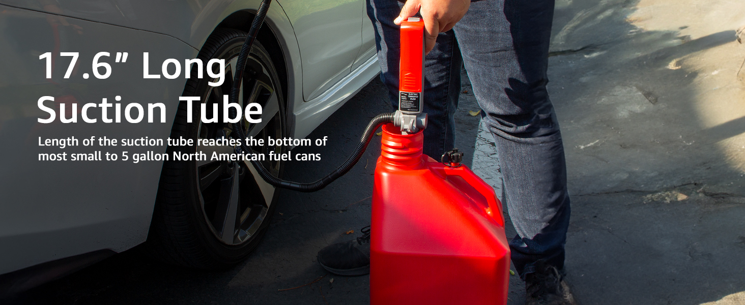 - STOP LIFTING HEAVY CANS | Flexible System Finally Gives Your Back a Break | Operate the Pump with One Hand or 100% Hands-Free—No Heavy Lifting! | Extra Long Transfer & Suction Tube Easily Reaches Inside High Cans, Big Water Jugs & Other Large Tanks, While the Oversized Transfer Hose Provides Further Length & Reach