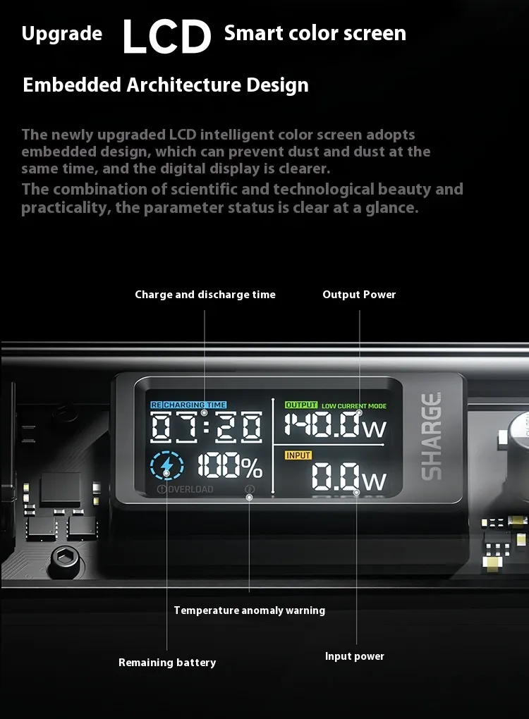 Integrated display shows battery level, output power, estimated runtime, and alerts for overload or faults, helping manage power usage