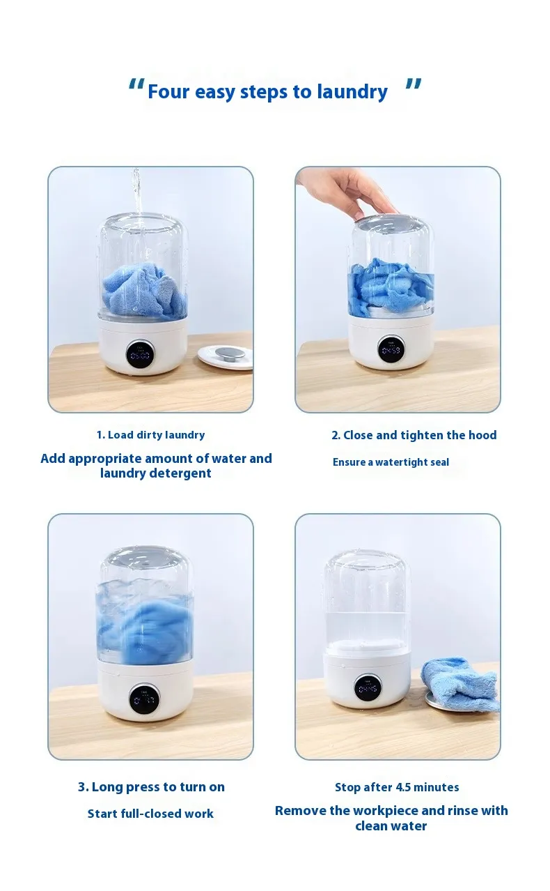 The Portable Underwear Washer Rechargeable Cordless Mini Washing Machine is a compact, lightweight laundry device engineered for washing small items quickly and effectively. It features a rechargeable battery, LED display for intuitive control, and a powerful internal motor that spins and cleans gently but thoroughly. This mini washer fits easily in luggage, backpacks, RVs, dorm rooms, apartments, and camper vans — making it perfect for travel and everyday convenience.