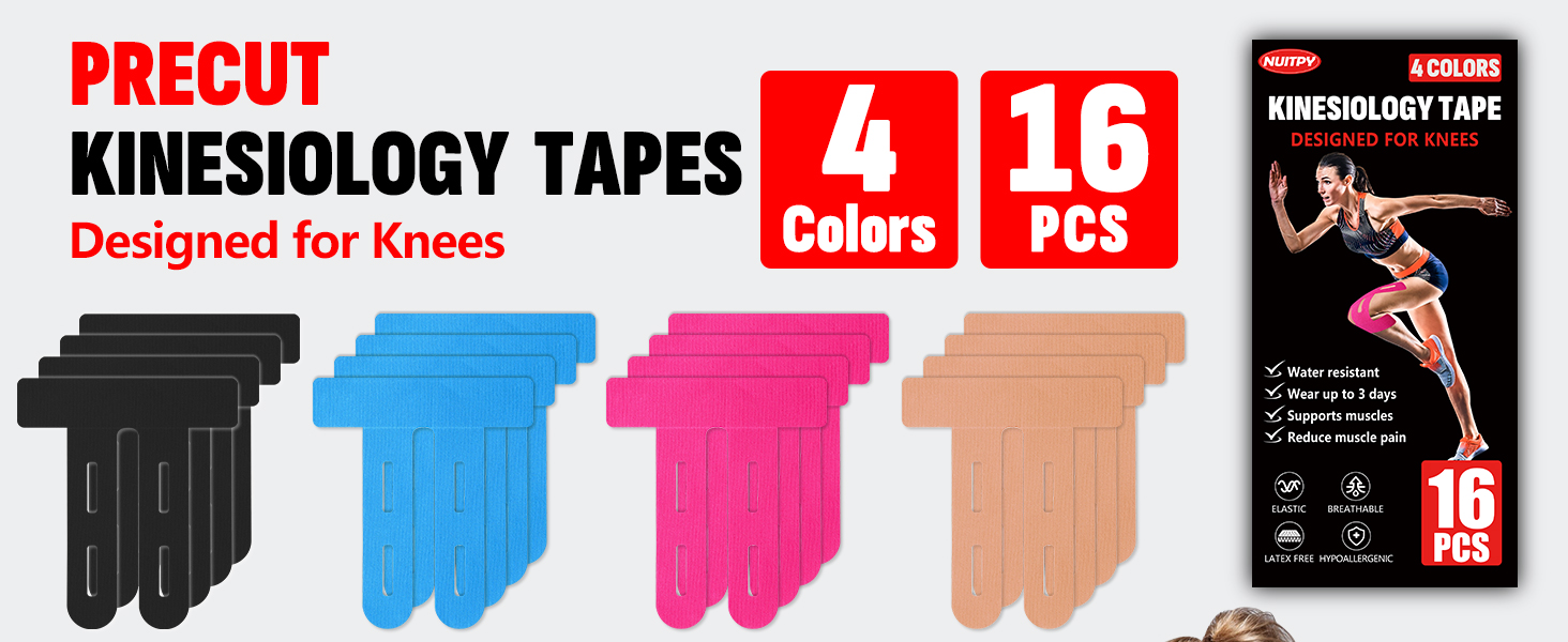 - Package includes 16 PCS precut kinesiology tape for knees. They all made of cotton and durable adhesive, These knee support tapes include 4 colors: skin color, light Blue, rose red, black