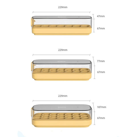 - Stackable ice tray with lid and bin: the master of saving space. The perfect compact size is 9.5 x 5.2 x 3.9 inches and fits nicely in caravan fridges and home freezers. This 4-in-1 set includes 2 ice cube trays with lids, 1 storage container, and 1 ice scoop.
