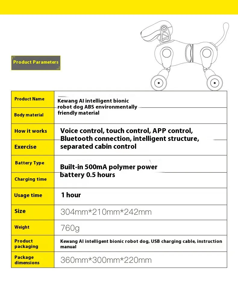 The Programming Dancing Bionic Interactive Early Education Accompany Intelligent Robot Dog is an innovative and educational robot designed to engage and entertain children while promoting early learning and creativity. Equipped with interactive features, dancing abilities, and bionic programming, this intelligent robot dog provides hours of entertainment while teaching valuable skills such as programming, problem-solving, and motor coordination. Perfect for children who love technology and animals, this robot dog offers a unique combination of fun and education.