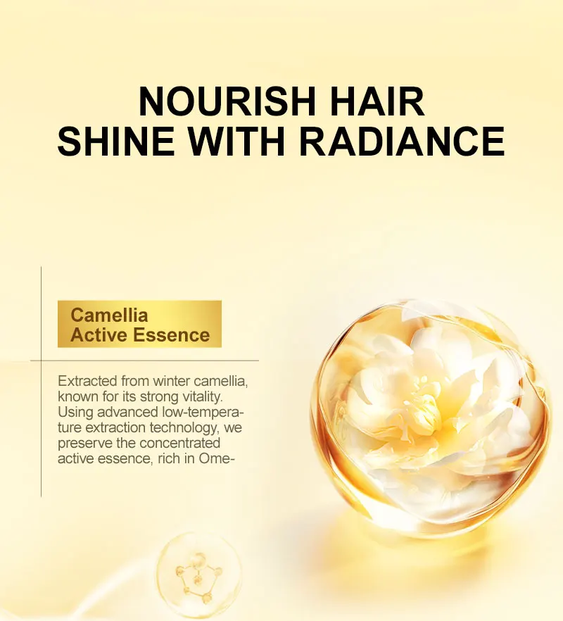 Extracted from winter camellia, known for its strong vitality. Using advanced low-temperature extraction technology, we preserve the concentrated active essence, rich in Omega-3, 7, and 9 fatty acids, which release powerful antioxidant energy, resulting in glossy, radiant hair.
