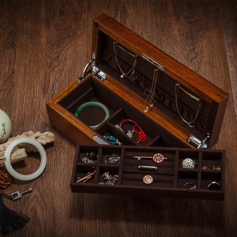 Pure Solid Wood Double-layer Jewelry Box With Lock