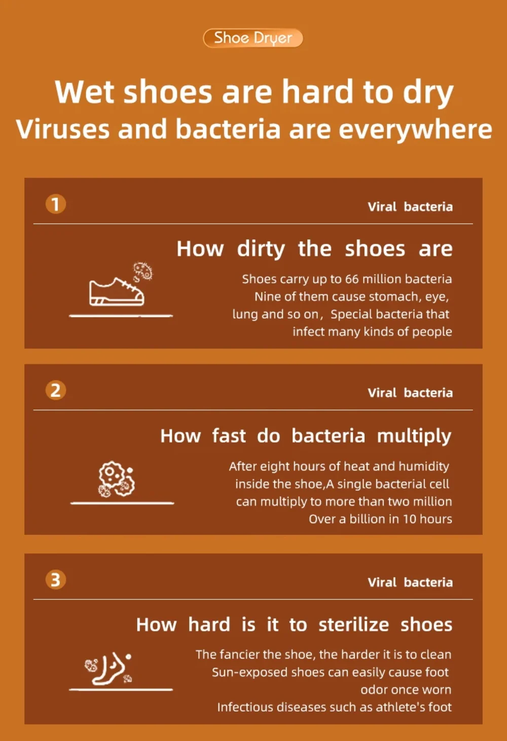 • Deodorization and Disinfection: This dryer can not only dry shoes, but also deodorize and disinfect them, making them smell fresh and