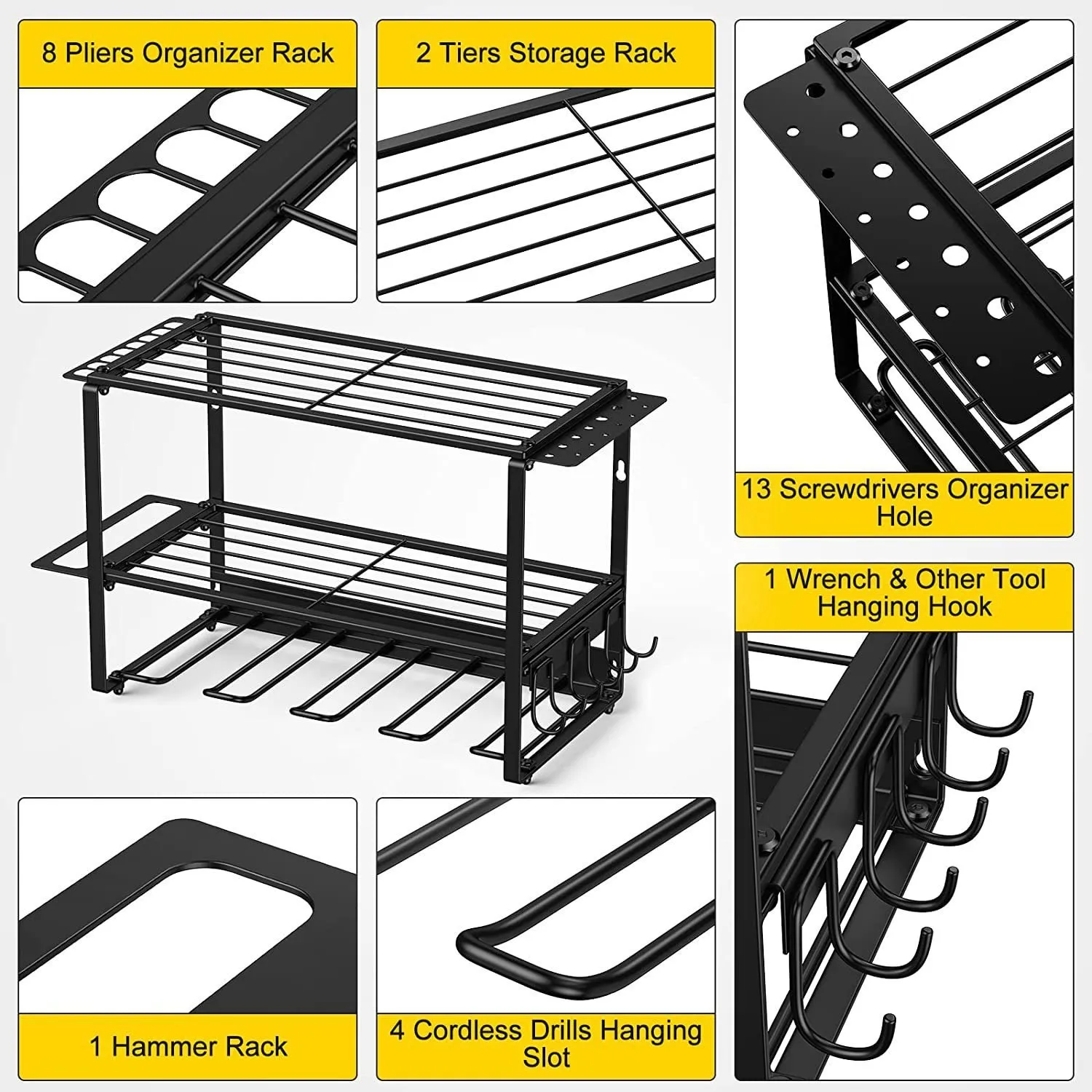 The Rack Tool is designed to accommodate a wide range of tools and equipment, including hand tools, power tools, screws, nails, and accessories. Whether you need a rack for simple hand tools like pliers and screwdrivers or a more robust storage solution for drills, saws, and other power tools, the Rack Tool offers the flexibility you need to keep everything in its place.