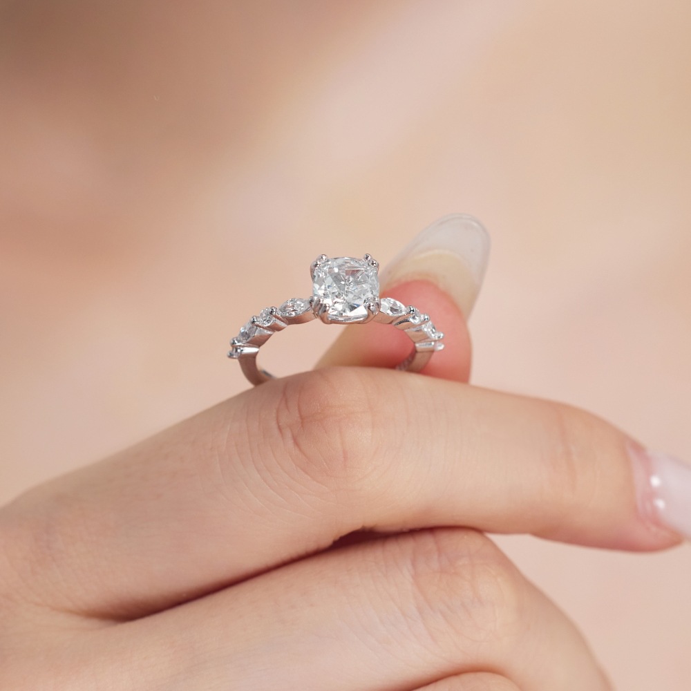 - Dazzling Centerpiece: The ring features a magnificent cushion cut diamond as its centerpiece, available in both stunning pink and classic white options. The cushion cut maximizes the diamond's brilliance, creating a captivating sparkle that draws attention.
