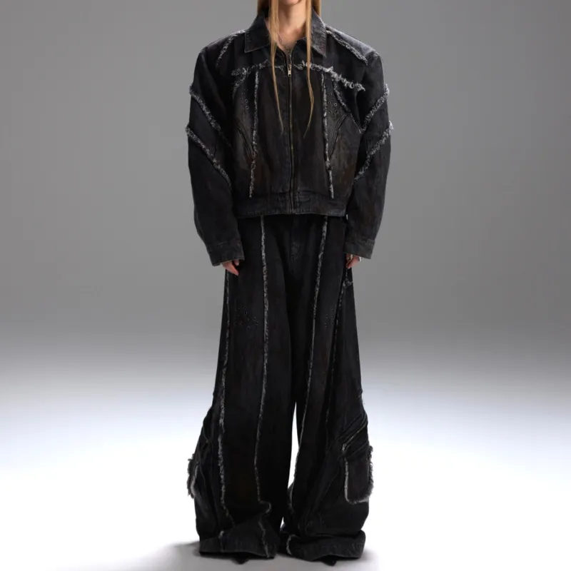 Raw Edge Splash-dyeing Distressed Padded Shoulder Denim Coat