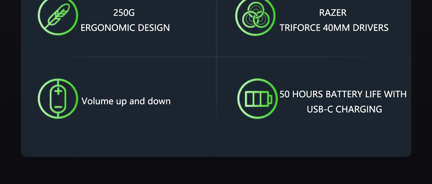 USB-C Wireless + Bluetooth Wireless Multi-Platform Connectivity, 250 g Ergonomic Design, Razer™ TriForce 40mm Drivers,Battery Life 20 hrs, Volume up and down,Detachable HyperClear Cardioid Microphone,Multi-Platform Compatibility.