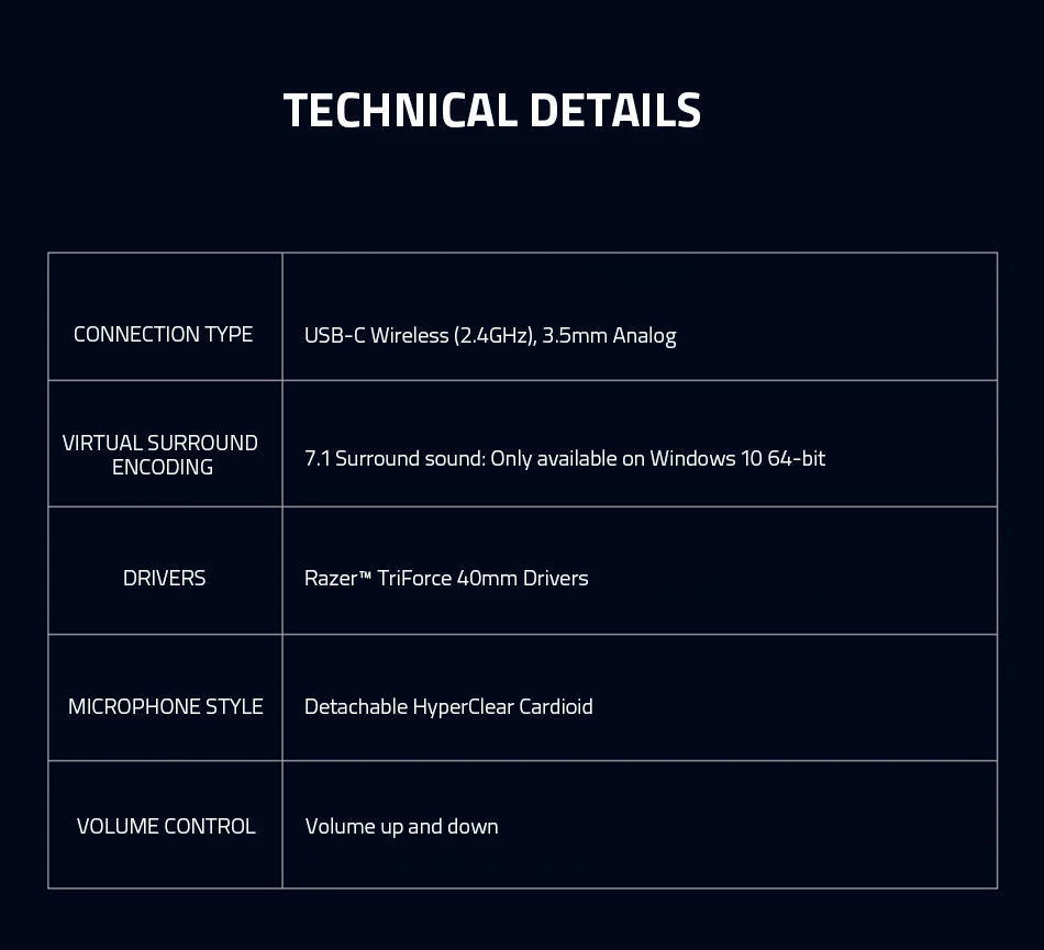 USB-C Wireless + Bluetooth Wireless Multi-Platform Connectivity, 250 g Ergonomic Design, Razer™ TriForce 40mm Drivers,Battery Life 20 hrs, Volume up and down,Detachable HyperClear Cardioid Microphone,Multi-Platform Compatibility.