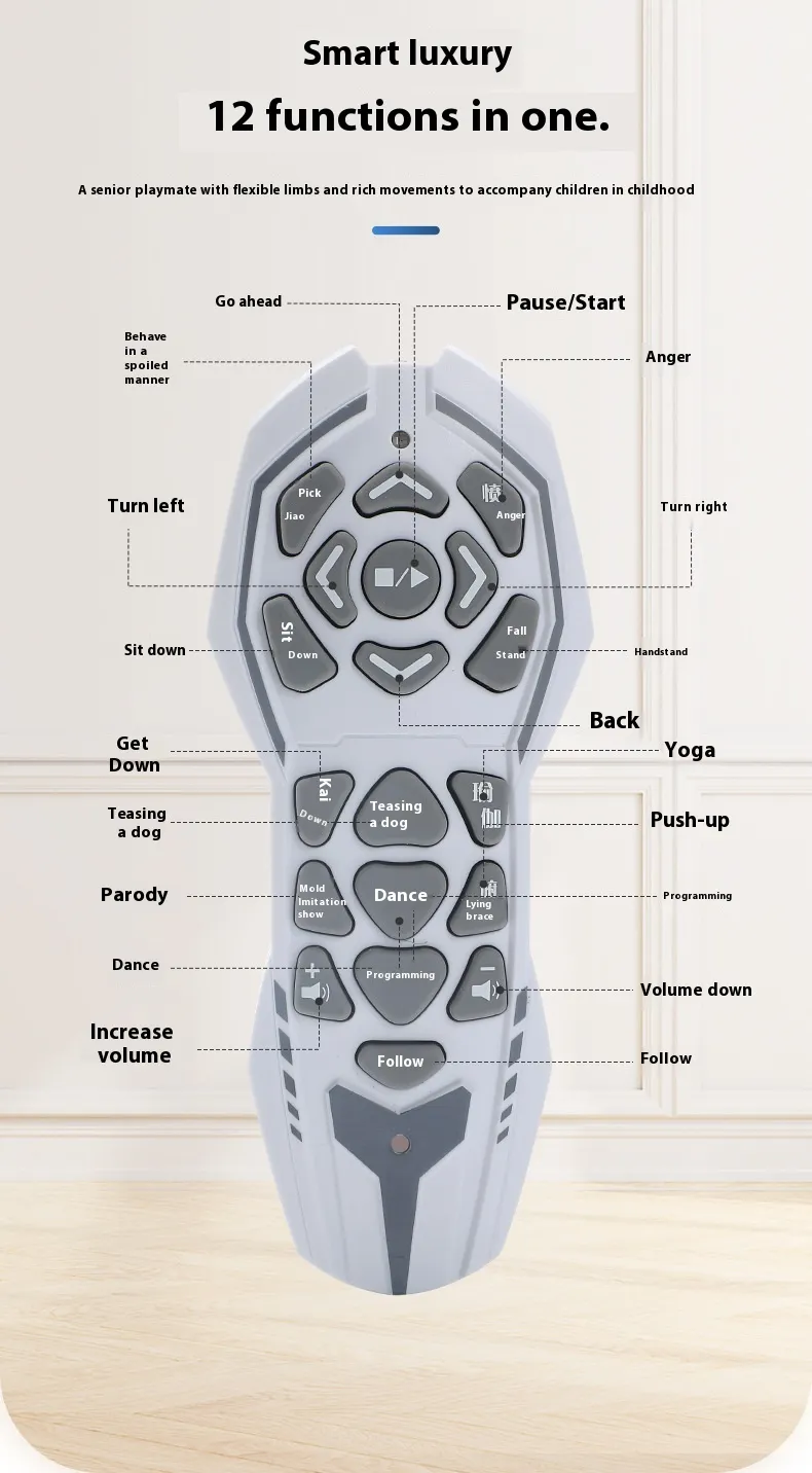Features: follow, forward, stand, push-up, song, programming, sitting, handstand, down, etc.