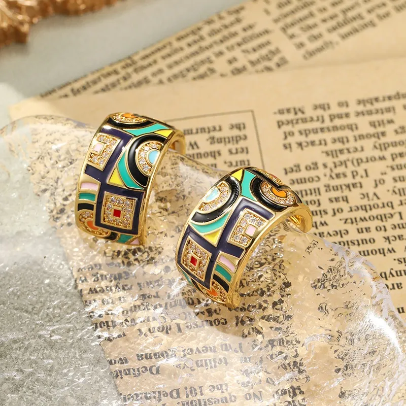 Retro Color Enamel C- Shaped Stud Earrings For Women