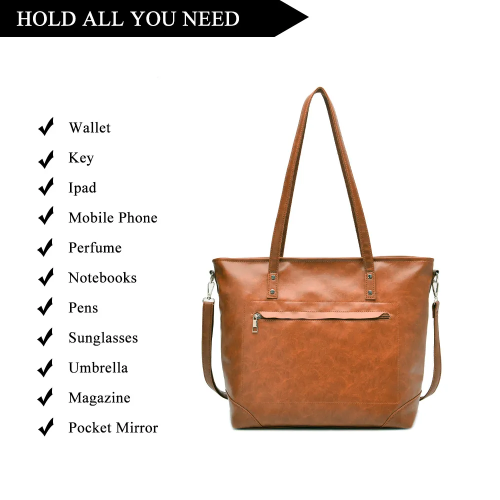 Designed with a large main compartment and additional pockets, this tote easily accommodates your essentials, including a laptop, wallet, makeup, and more.