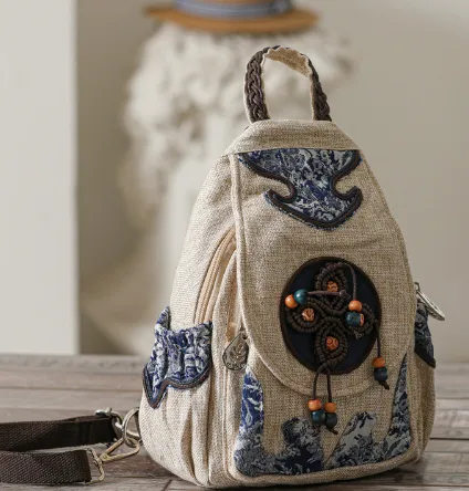 Product: Retro Style Artistic Crafts Woven Pouch – Leisure and Convenient Dual-Use Canvas Chest Bag with Multi-Zipper Design