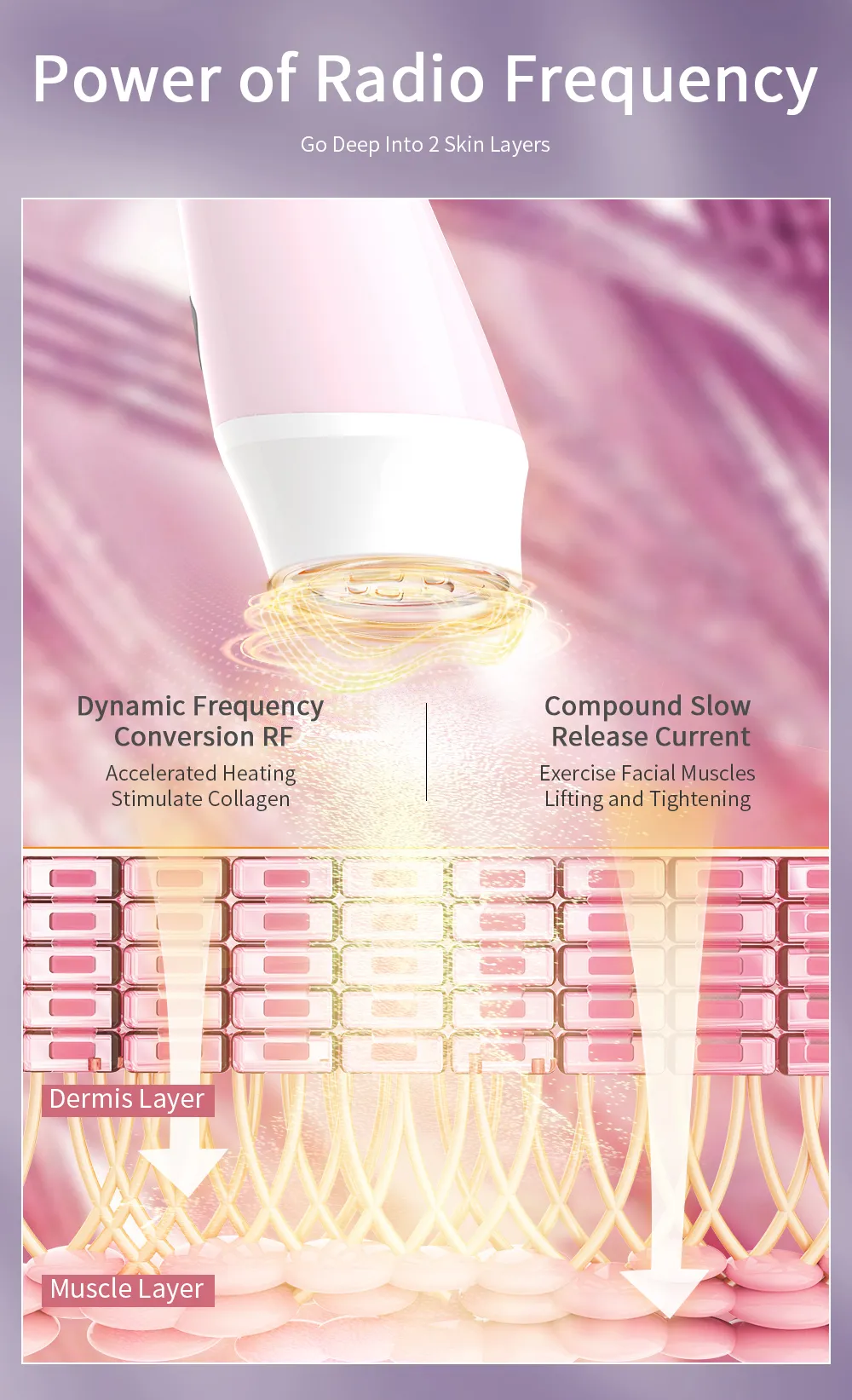 This multi-functional beauty device targets a range of skin concerns, from wrinkles and sagging to uneven skin tone and texture issues. Whether you're combating the early signs of aging or looking to enhance skin appearance, this instrument provides a targeted solution for smoother, tighter, and more rejuvenated skin.