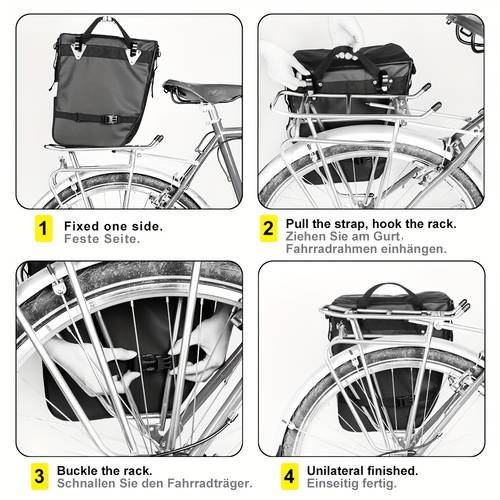 3-in-1 Design: This bag can be used as a large rear bag, split into two individual panniers, or combined with a side pouch