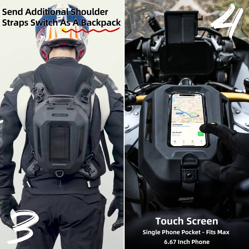The Rhinowalk Touchscreen Motorcycle Tank Bag is an essential accessory for any rider who needs easy access to their gear and a secure storage solution. With its 5.6L capacity, touchscreen-compatible pocket, and multi-functional compartments, this bag offers practical storage for all your essentials, whether you’re riding through the city or embarking on a long motorcycle adventure. Stay organized, comfortable, and connected on your next ride with this durable, versatile tank bag.