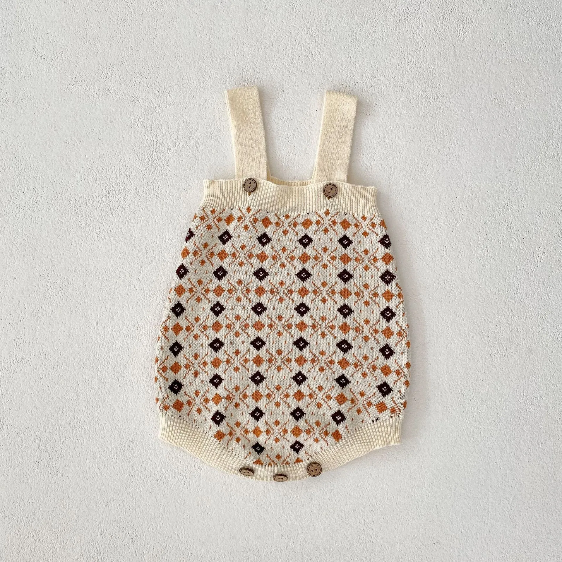 Ideal for cooler weather, this suit offers the perfect balance of warmth and breathability, making it suitable for both indoor and outdoor activities. Whether it’s a family gathering, a playdate, or a day out at the park, the Rhombus Jacquard Knitted Coat Strap Rompers Jumpsuit Suit ensures your baby stays cozy, stylish, and comfortable.