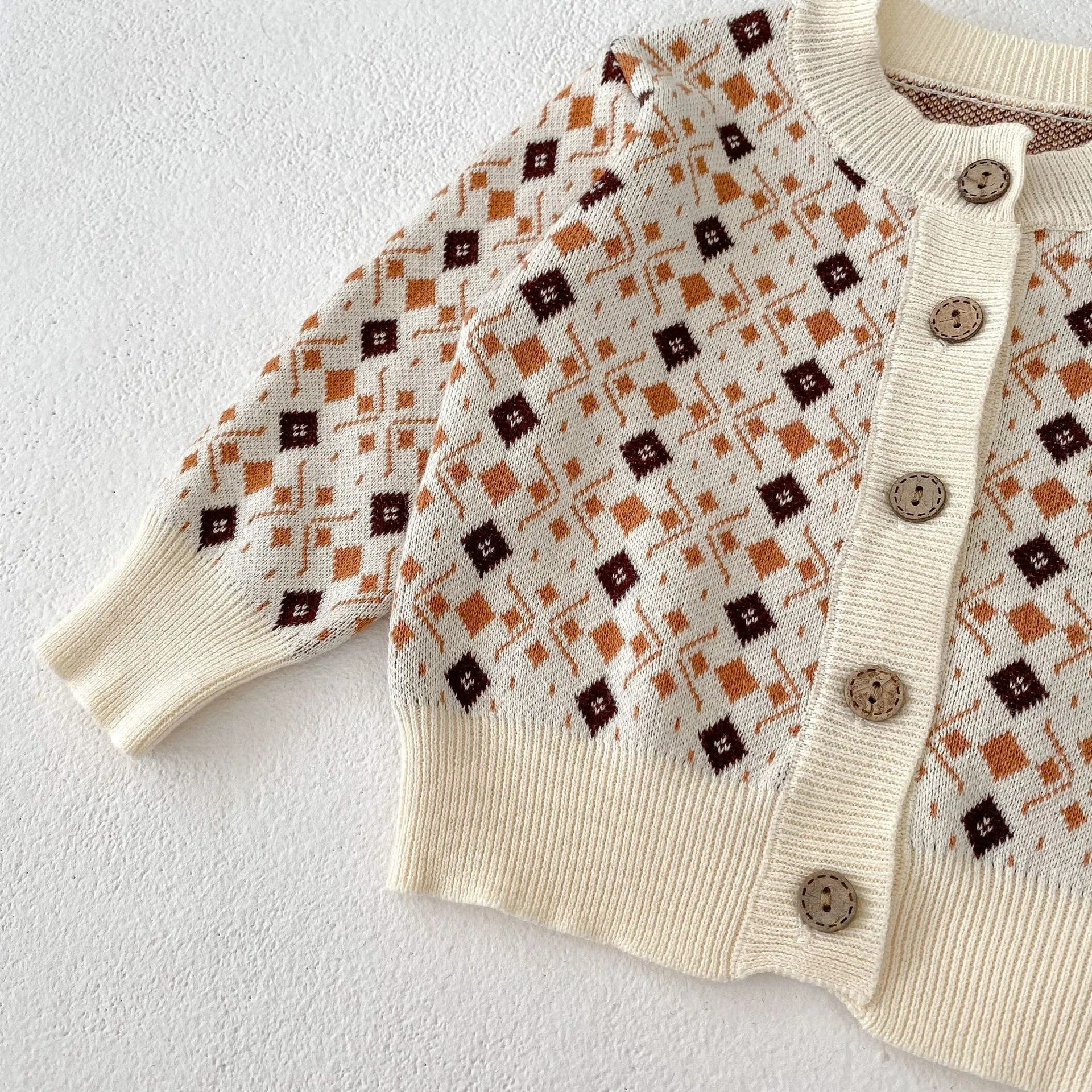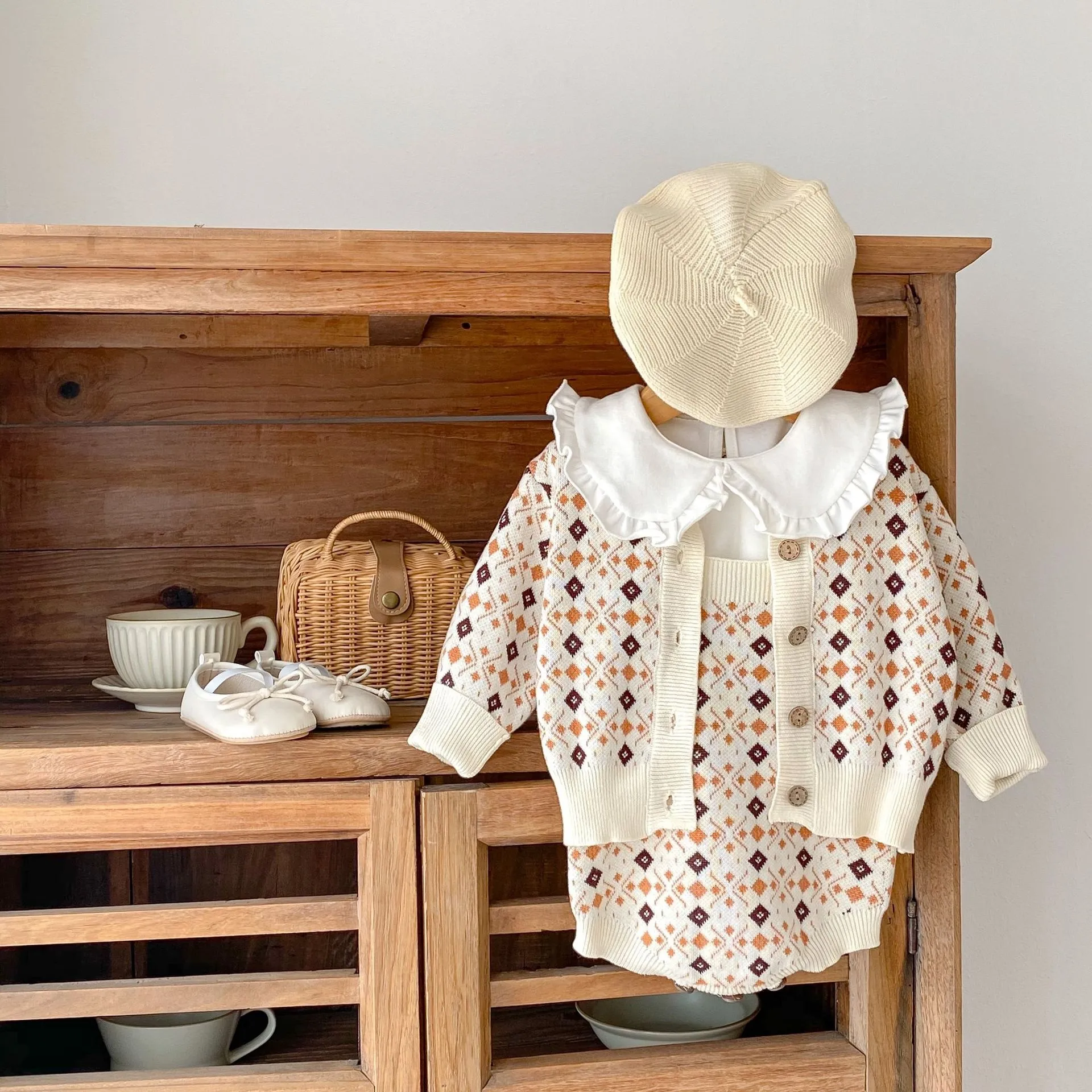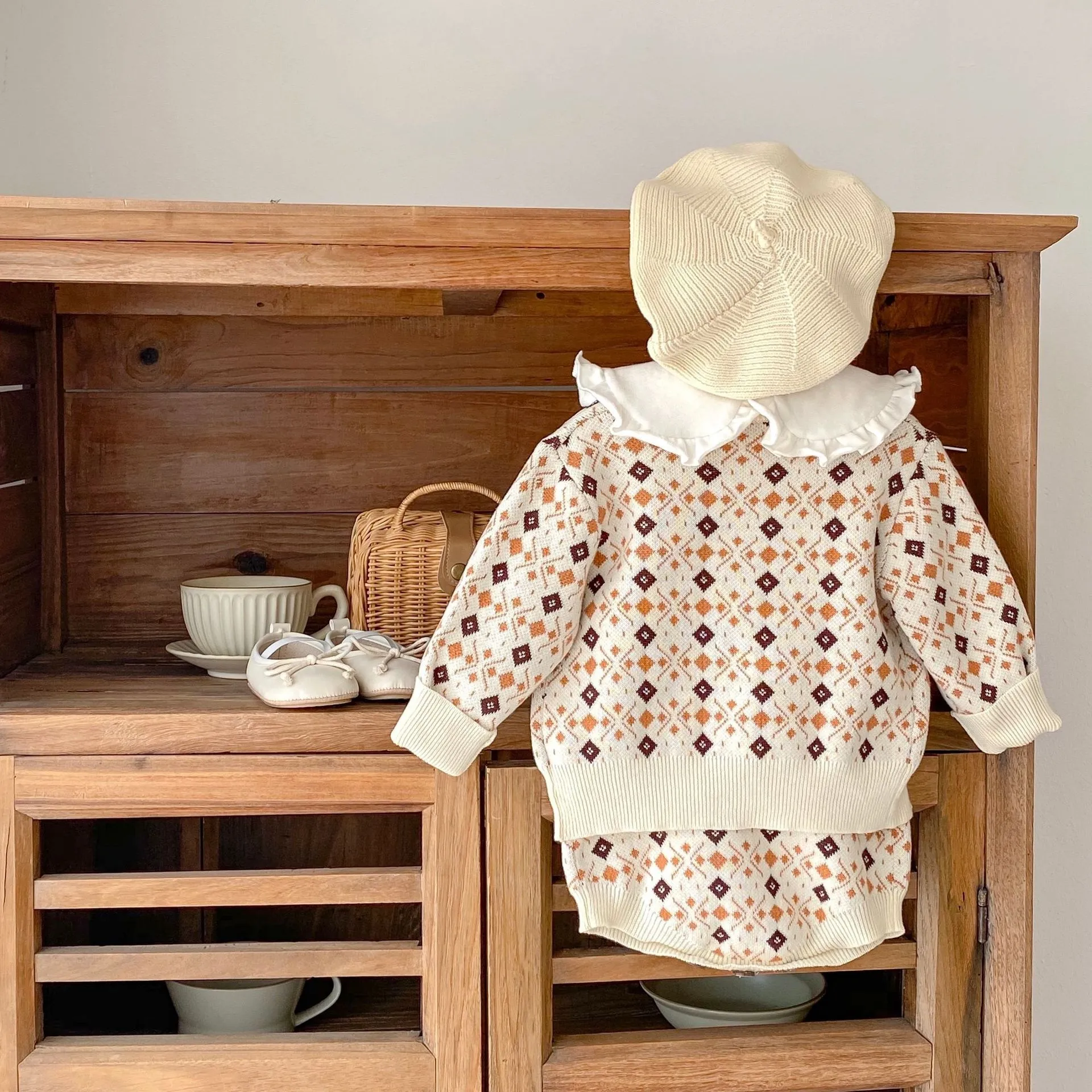 Charming Rhombus Jacquard Pattern: The intricate jacquard design features rhombus patterns that give the outfit a textured,