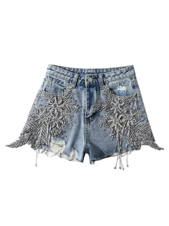 Make a bold statement with the Ripped Jeans With Diamond Flowers. Combining edgy ripped denim with the elegance of diamond