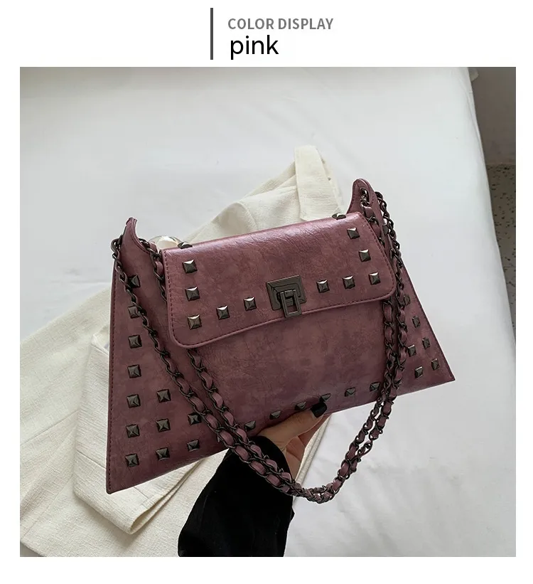 This bag features a modern rivet-adorned design that complements any outfit, making it perfect for various occasions.