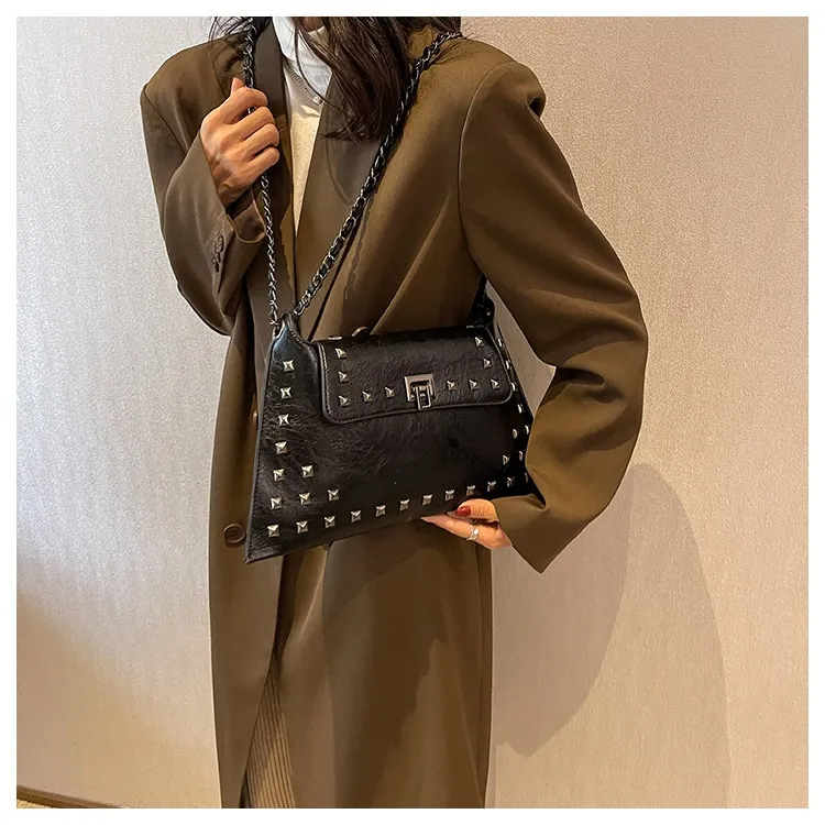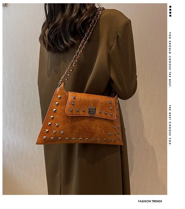 This bag features a modern rivet-adorned design that complements any outfit, making it perfect for various occasions.