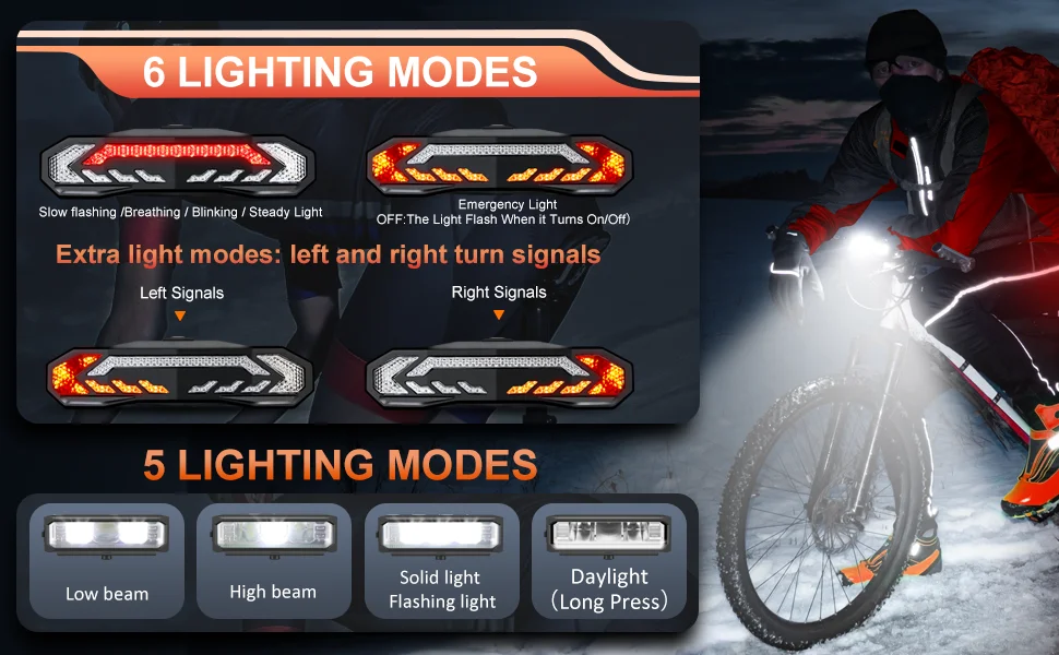 ● [MORE IN ONE SMART BIKE TAIL LIGHT WITH TURN SIGNALS]: Multi-function anti-theft bike alarm tail lights. Feature with brake light /turn signal/warning light/electric bell/anti-theft alarm. 31 COB LEDs to bring the brightness of the bicycle taillight to reach 160 lumens, 200-degree wide-angle design makes you more visible during the night ride. With 6 lighting modes, Slow Flashing / Breathing / Fast Blinking/ Steady Light / Emergency Light / OFF.