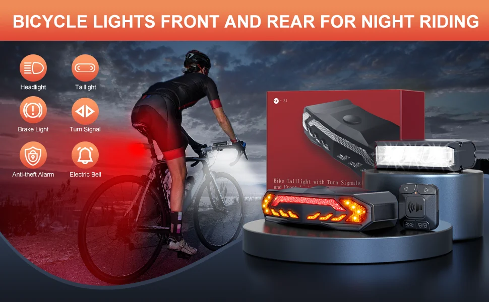 â— [MORE IN ONE SMART BIKE TAIL LIGHT WITH TURN SIGNALS]: Multi-function anti-theft bike alarm tail lights. Feature with brake light /turn signal/warning light/electric bell/anti-theft alarm. 31 COB LEDs to bring the brightness of the bicycle taillight to reach 160 lumens, 200-degree wide-angle design makes you more visible during the night ride. With 6 lighting modes, Slow Flashing / Breathing / Fast Blinking/ Steady Light / Emergency Light / OFF.