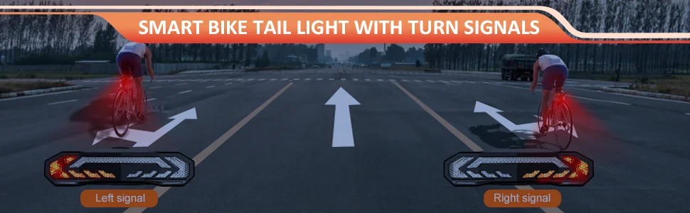 â— [BIKE TAIL LIGHT WITH TURN SIGNALS FUNCTION]: Turn on right/left turn signals through the wireless remote control and get drivers' attention from several blocks away, securing your safety when riding in traffic. The taillight will beep when you turn left or right, keep beeping for 2 minutes, and then turn off automatically. Designed with the smart brake sensor, bike light will auto highlight for 2s after braking to alert other drivers behind you.(Except for Emergency Light Mode)