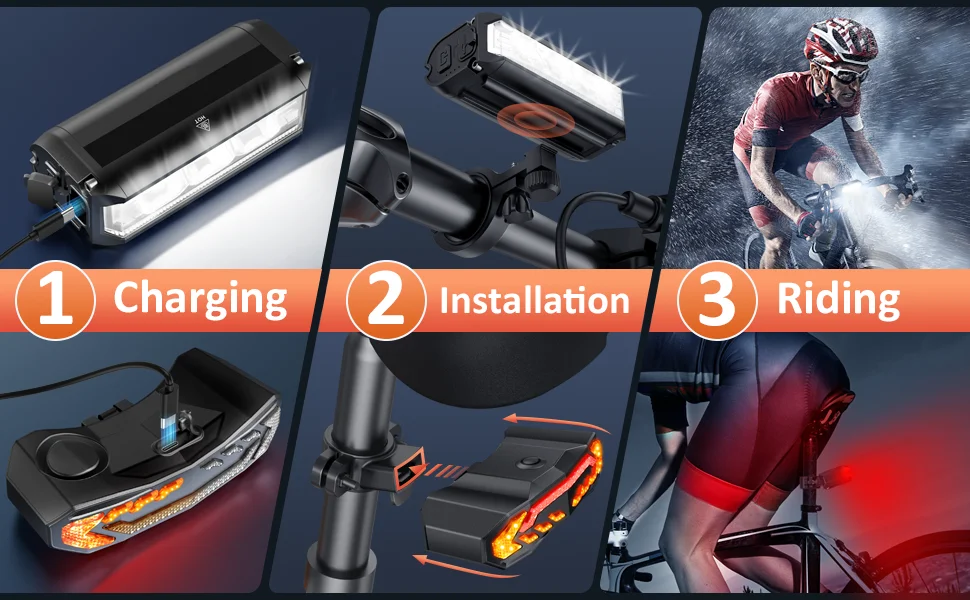 â— [BIKE HEADLIGHT-TAILLIGHT COMBINATIONS]: Get your bike with both the front and back light at the same time. The main front light and rear red light have multiple settings to adjust the brightness and flashing sequence. Ultra bright light that lights up a wide area to get the attention of those car drivers and useful for any evening commuting. [In addition, the taillights come with turn signals and bicycle alarms feature, through the wireless remote control].