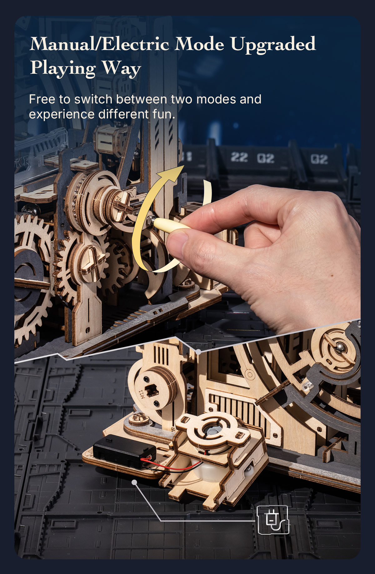 At its core, the ROKR Marble Spaceport is a functional marble run with six unique diversion mechanisms and five different tracks, each offering different trajectories for the marbles. This combination of diverse tracks and features makes the puzzle not only visually stimulating but also mechanically captivating as marbles race through spirals, ramps, and vertical lifts. Whether you're using the hand crank to manually operate the mechanism or activating the electric motor for automated movement, the entire system comes to life with a fascinating display of gears, pulleys, and ramps. The dual-drive feature offers versatility and allows users to experience two different modes of play.