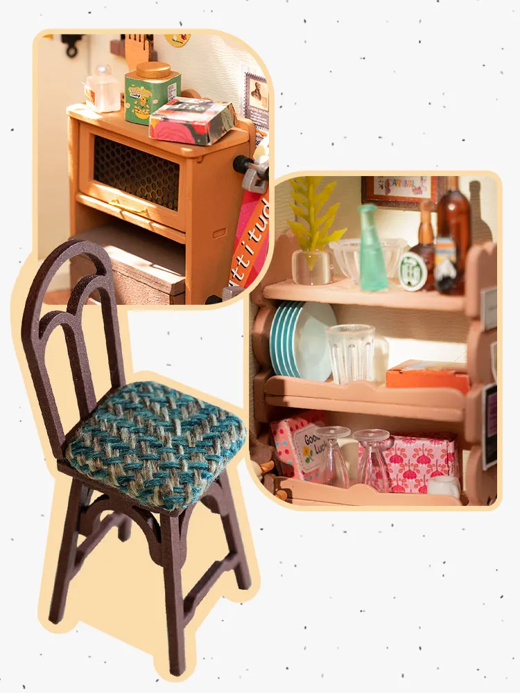 From miniature furniture to tiny utensils, every piece is meticulously designed to create an authentic kitchen scene.
