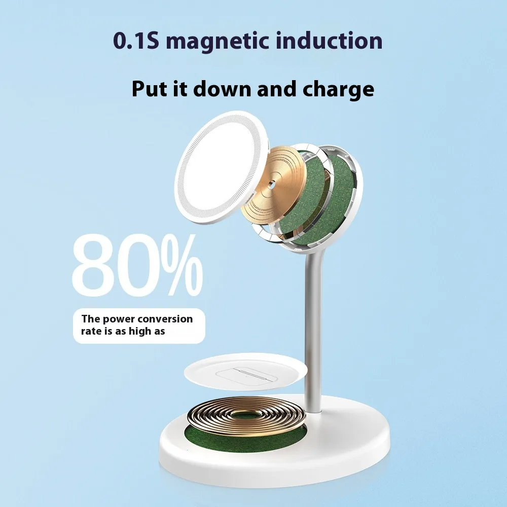 The Rotatable Three-in-one Wireless Charger is designed to simultaneously charge your smartphone, smartwatch, and wireless earbuds. Perfect for home, office, or bedside use, this charger keeps your devices powered and organized in one convenient location.