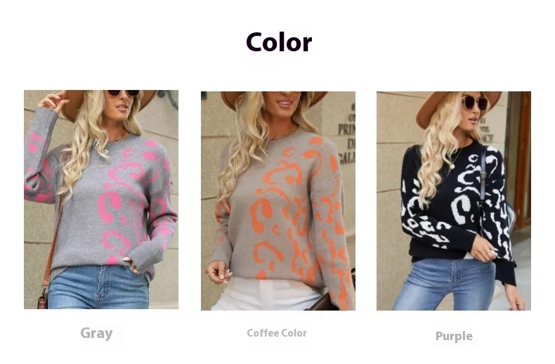 The Round Neck Pullover Leopard Print Long Sleeve Mid-Length Sweater is perfect for women who love to incorporate bold prints into their everyday wardrobe without sacrificing comfort. The leopard print gives this sweater a unique, trendy look, while the long sleeves and round neck offer warmth and ease of wear. Its mid-length cut makes it perfect for both casual and semi-casual occasions, while the soft fabric ensures that you remain comfortable all day long.