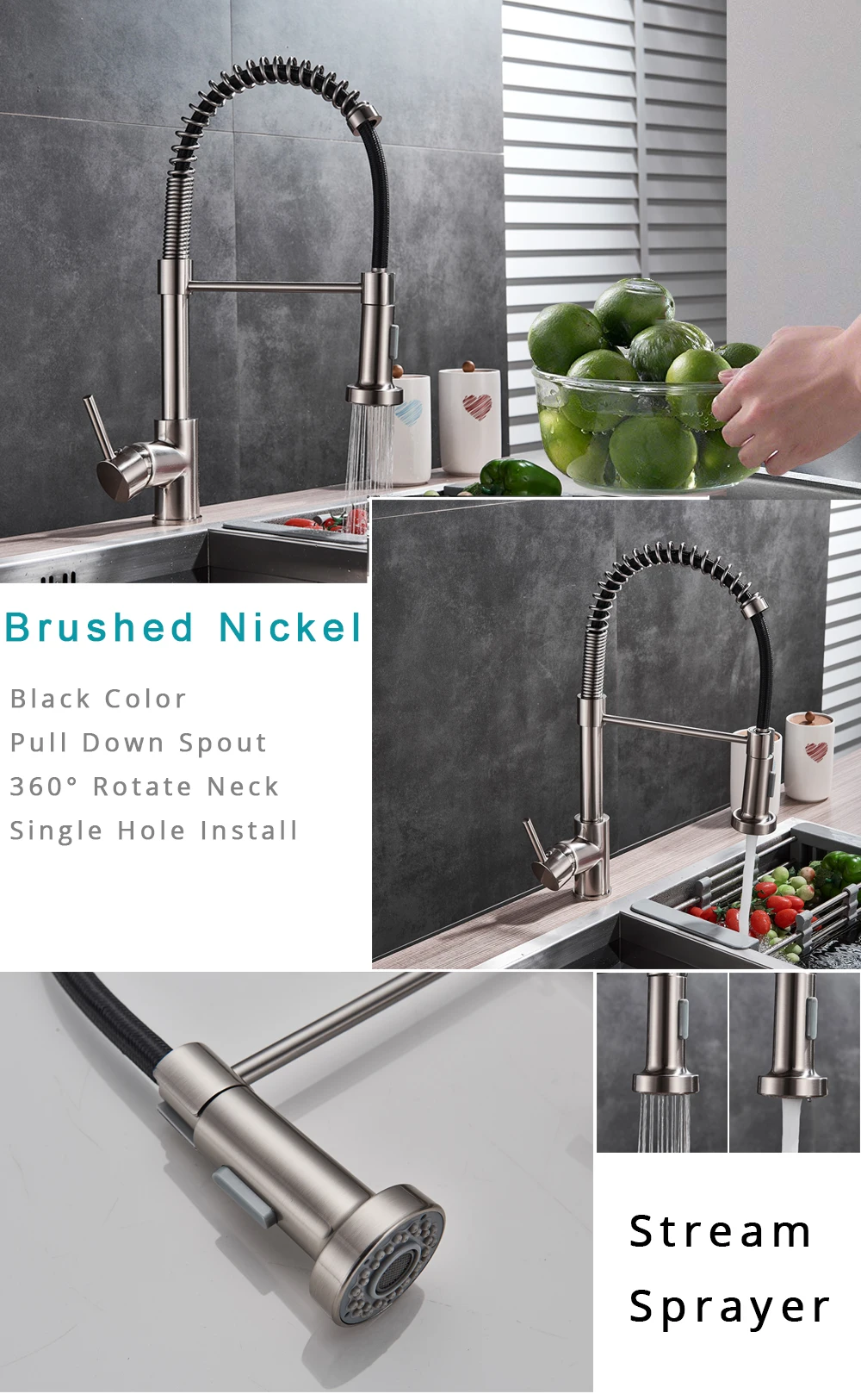 Brushed Nickel Finish: The elegant brushed nickel finish adds a touch of sophistication to your kitchen decor. It resists