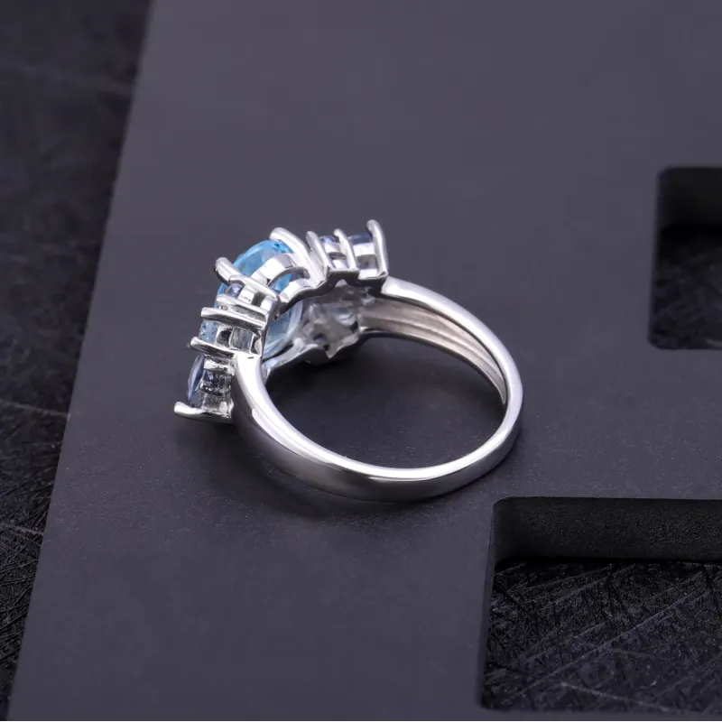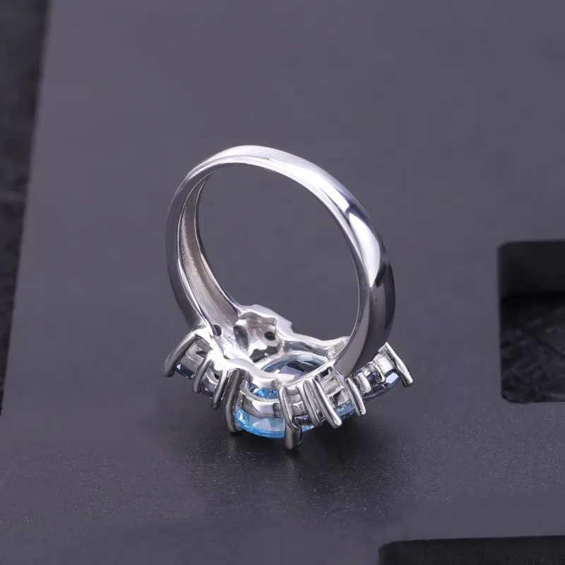 S925 Sterling Silver Natural Topaz Gemstone Ring Elegant Blue Statement Jewelry