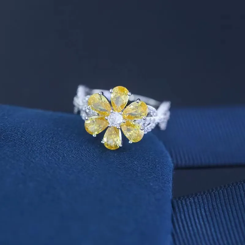 S925 Sterling Silver Six-Leaf Flower Crystal Ring Elegant Floral Jewelry for Women