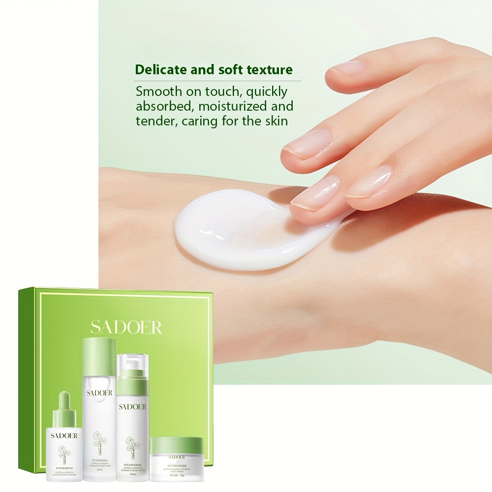 The Sadoer Centella Asiatica Overnight Moisture Set is a four-piece skincare collection that works overnight to hydrate and rejuvenate the skin. With key ingredients like Centella Asiatica, this set helps to improve skin elasticity, soothe irritation, and lock in moisture, ensuring your skin stays soft, smooth, and healthy. Whether you’re dealing with dry skin, irritation, or signs of aging, this set provides the nourishment your skin needs for a radiant complexion.