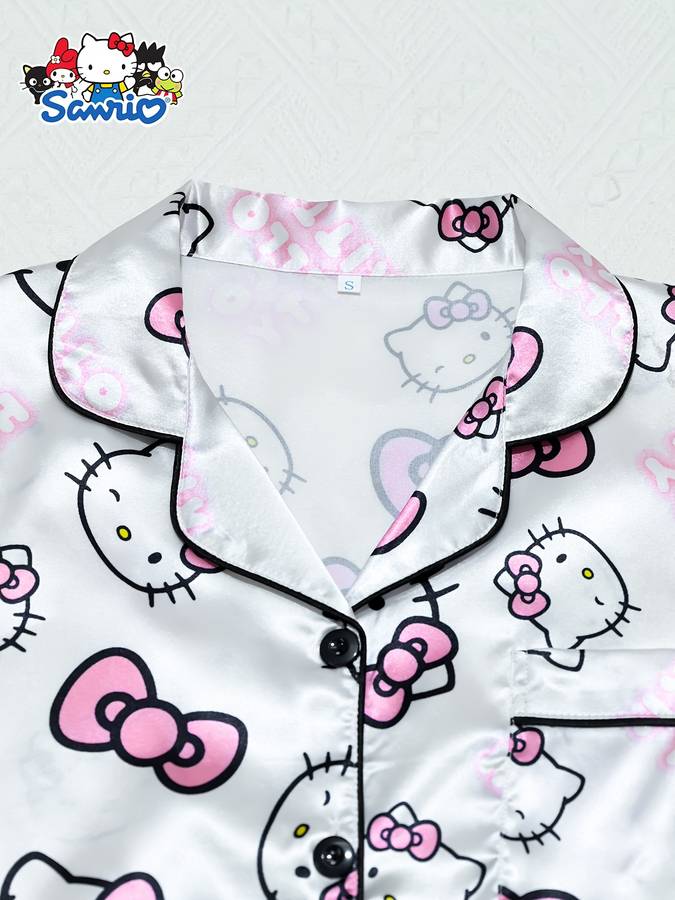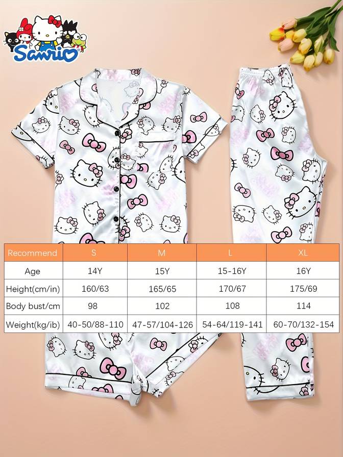 Made with a soft satin-feel woven fabric using 97% polyester and 3% elastane, the set offers a smooth, lightweight texture with just enough flexibility for all-season comfort. The adorable Hello Kitty cartoon print adds a playful touch that makes the set fun to wear for relaxing at home, sleepovers, pajama parties, or weekend lounging.