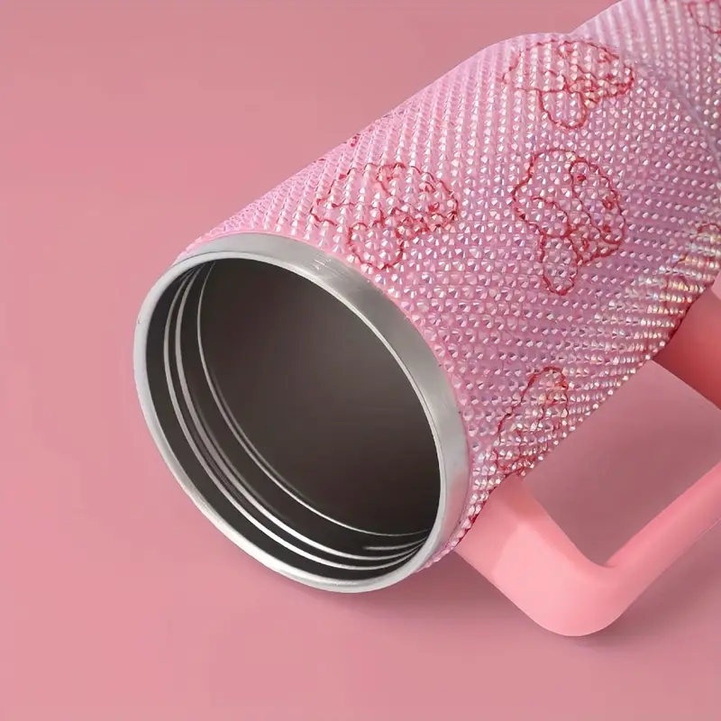 The bottle features a rhinestone-accented lid for a touch of shimmer and a wide-mouth design for easy filling, cleaning, or adding ice cubes. A built-in straw allows convenient sipping on the go, while the portable handle makes carrying easy during travel, gym sessions, or outdoor adventures.